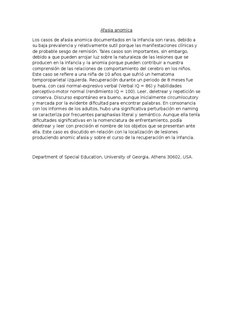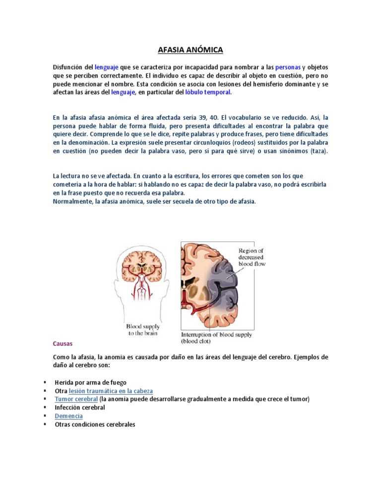 Afasia Anomica : Afasia anómica - espacioLogopedico - L'afasia anomica è un particolare tipo di afasia fluente, i pazienti affetti da tale disturbo hanno difficoltà a trovare i termini esatti con cui esprimersi, riescono tuttavia a pronunciare quelle stesse parole su imitazione.. A volte deriva da una malattia progressiva (p. L'afasia deriva solitamente da disturbi che non causano danno progressivo (p. Es., ictus, trauma cranico, encefalite); La comprensione e le competenze per il linguaggio scritto sono generalmente meno compromessi. Se distingue por generar frases entrecortadas e incompletas, y entonaciones de lo más variado.